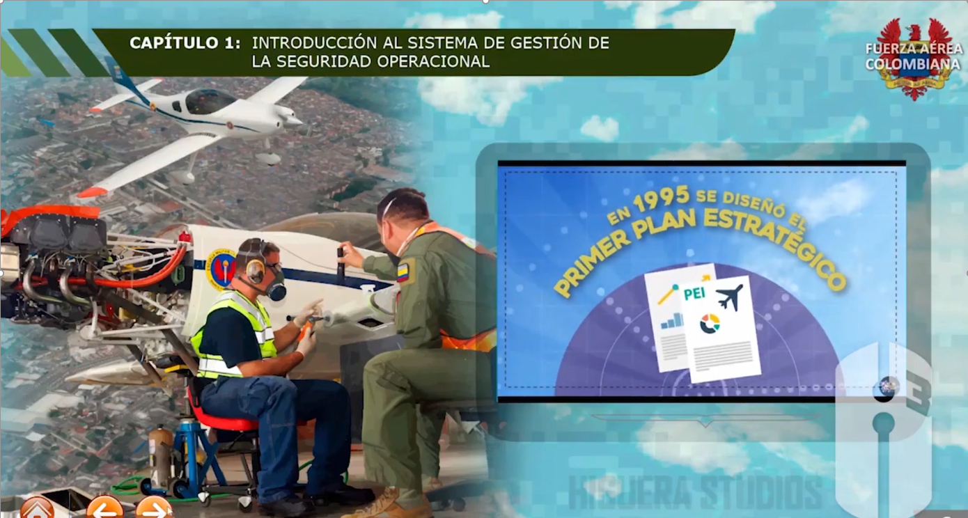 MOOC Massive Online Open Courses (Massive Open Online Courses) interactive courses with high multimedia content developed for the Colombian Air Force, based on the SCORM Shareable Content Object Reference Model standard and with a web-only target platform, along with the respective deployment on BlackBoard's LMS Learning Management System and training for content modification or updating.